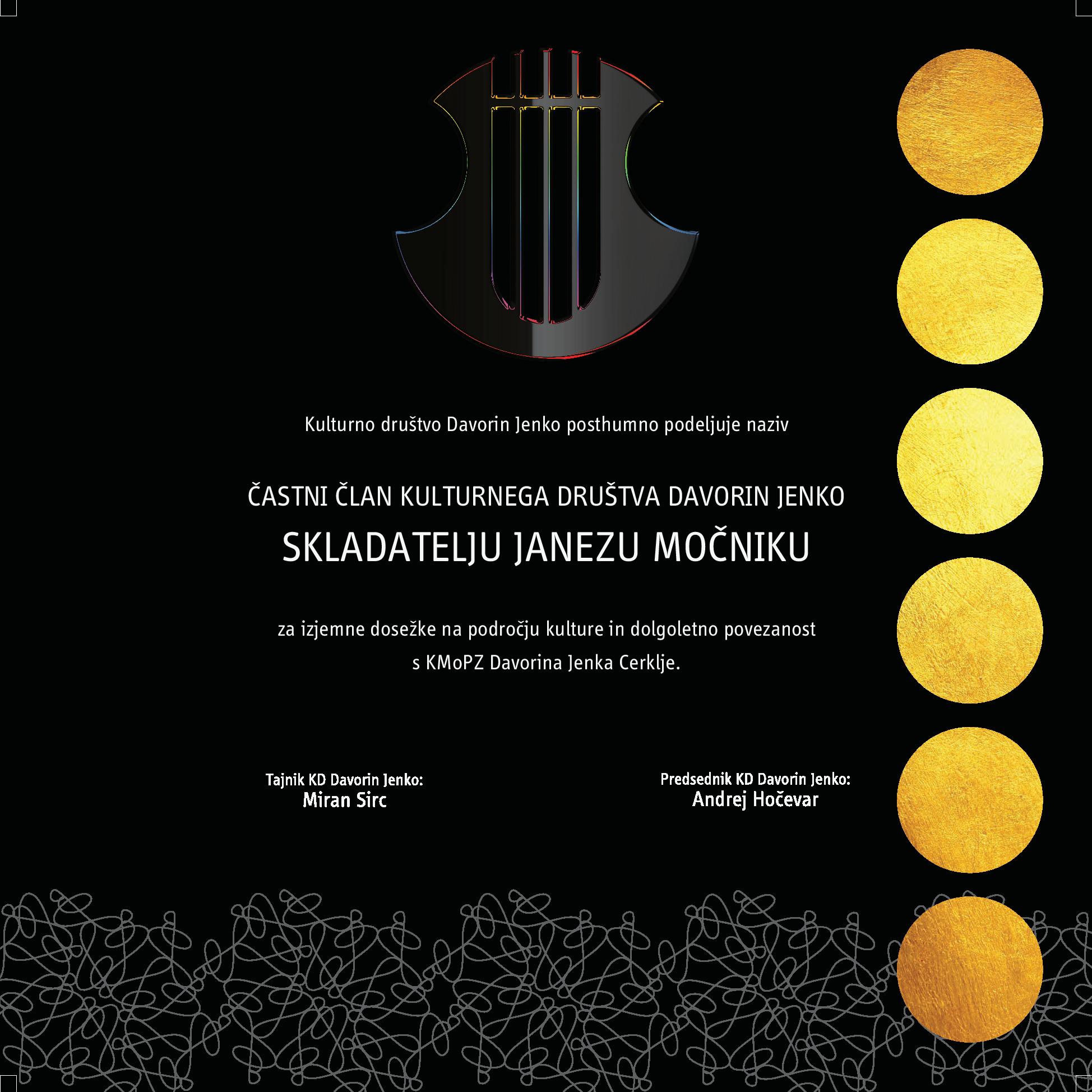 Ko je ob navdušenju občinstva že drugič odzvenela Simonitijeva radoživa Na Vipavskem, je sledil še en zelo pomemben in prijeten del večera, ko smo slavljencu ob njegovi 50 letni poti glasbenega udejstvovanja podelili obeležja zahvale za njegovo delo. Člani Kulturnega društva Davorina Jenka smo na letošnjem občnem zboru sklenili, da zborovodji Jožefu Močniku za dolgoletno odmevno delo zborovodje Komornega moškega pevskega zbora Davorina Jenka Cerklje podelimo naziv »Častni član Kulturnega društva Davorina Jenka«. Listino mu je podelil predsednik društva Andrej Hočevar, v spremstvu tajnika Mirana Sirca ter Simona Vošnjaka, ki je jubilantu izročil umetniško grafiko, kot spominsko darilo pevskega zbora. Mija Aleš, predsednica ZKD Kranj, predsednica ZKD Slovenije, predsednica Sveta JSKD Območna izpostava Kranj ter podpredsednica Nadzornega sveta JSKD, je ob asistenci Gregorja Grašiča slavljencu podelila Priznanje Zveze kulturnih društev za življenjsko delo ter Jubilejno priznanje Javnega sklada RS za kulturne dejavnost. Župan Franc Čebulj je našemu zborovodji izročil umetniško sliko kot zahvalo lokalne skupnosti za prizadevno dolgoletno delo na področju zborovske dejavnosti, s čimer je kulturno podobo našega kraja in širše skupnosti neizbrisno zaznamoval. Čestitkam sta se pridružila še predstavnika Cerkvenega mešanega pevsk