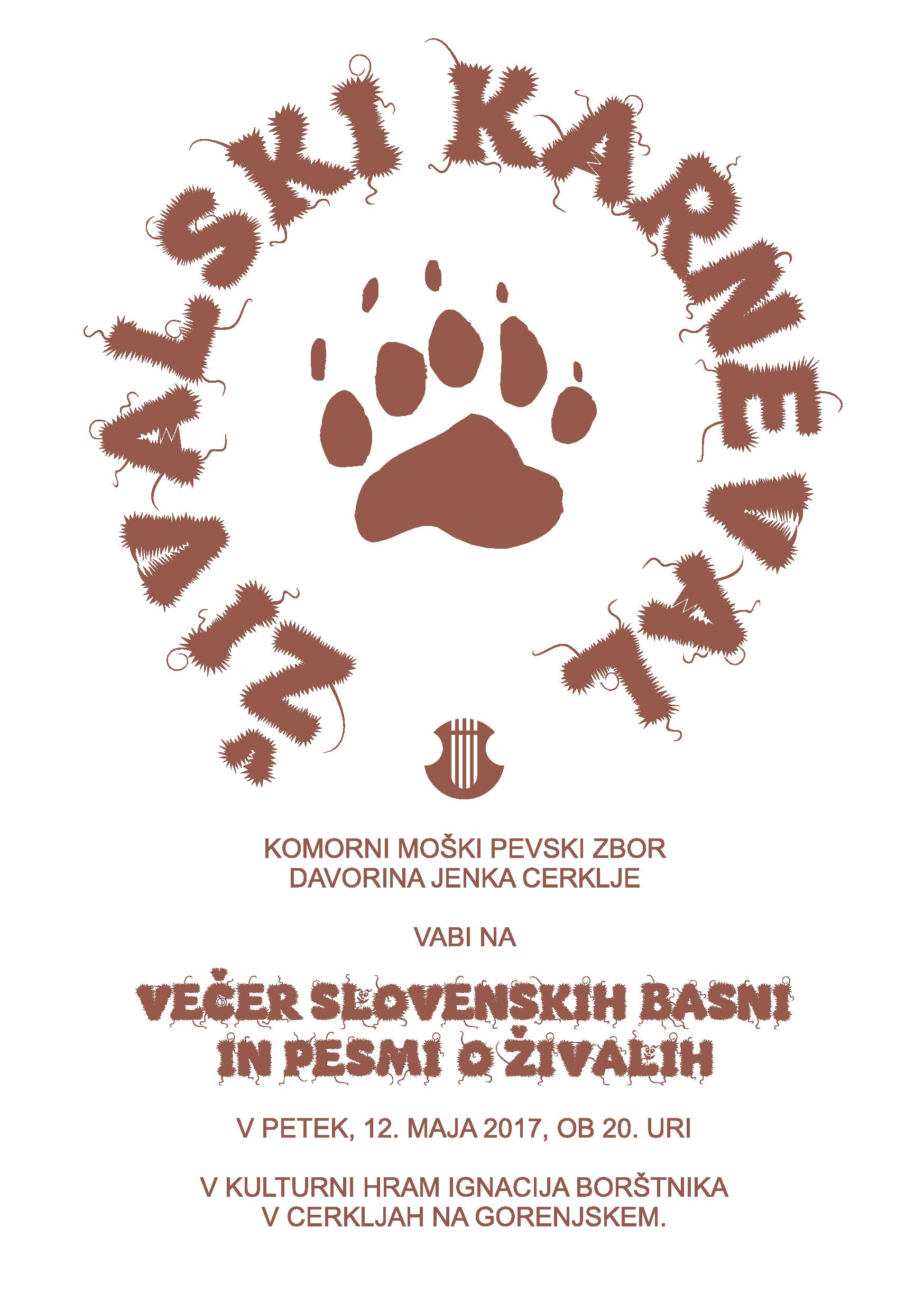 Letos smo se odločili za temo živalski svet – večer slovenskih basni in pesmi o živalih je poimenovan ,Živalski karneval‘. Na njem bo zbor predstavil vrsto skladb od renesanse (Jacobus Gallus – Quam gallina suum parit ovum) do današnjega časa (Janez Močnik – Črni kos). Pri pripravi sporeda se je izkazalo, kako mnogotero je prepletanje med človekom in živalmi tudi v pesmi, tako v umetni, še zlasti pa v ljudski, odnos človeka do živali, pa tudi obratno, navezanost živali na človeka. Posebno poglavje pa predstavljajo uglasbene basni (Vinko Vodopivec – Krokar in lisjak, ljudska (zapisal Janez Močnik) – Jager gre na jago, po ljudskem plesu (Egi Gašperšič) – Použek se je žent pršu itd.).